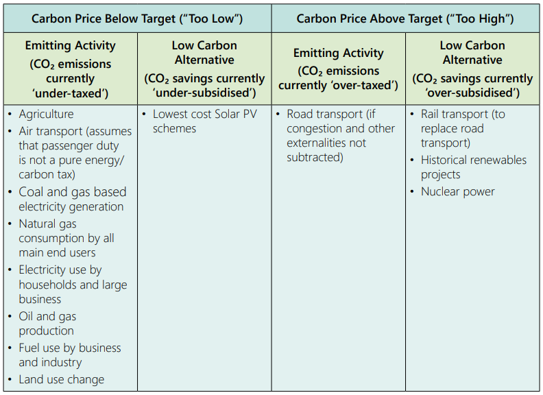 The table summarises how effective carbon prices for emitting activities (and low carbon alternatives) compare against the government’s estimated range for carbon prices consistent with meeting targets.