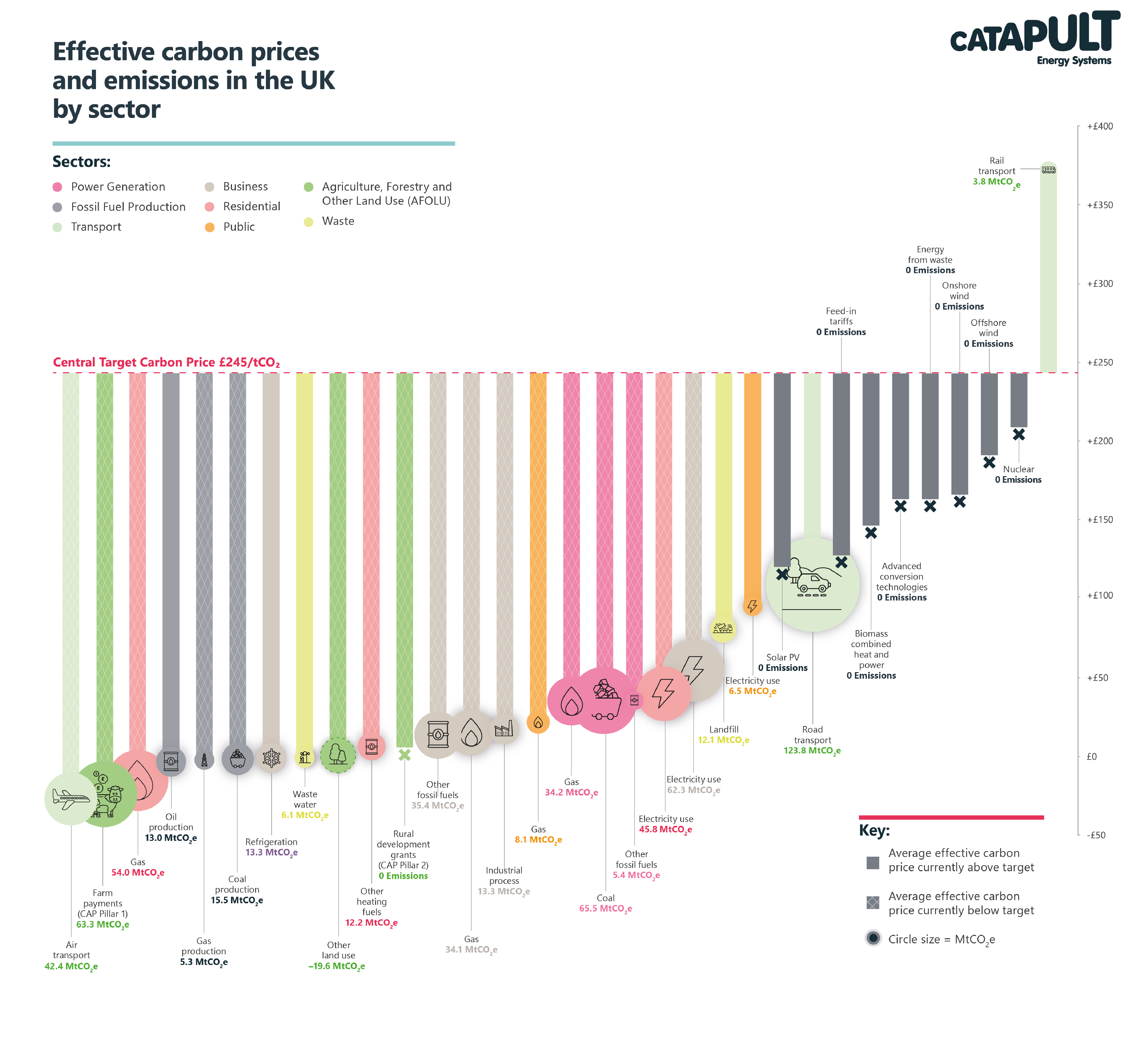 The report shows how decarbonisation incentives (i.e. the price paid per tonne CO2e) arising from current UK policies vary wildly across different sectors, even though the value of emissions reductions for mitigating climate change is the same. In simple terms, this suggests we may be over-rewarding some kinds of emissions-reducing activity while under-rewarding it in other activities or sectors.
